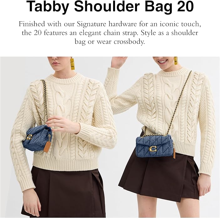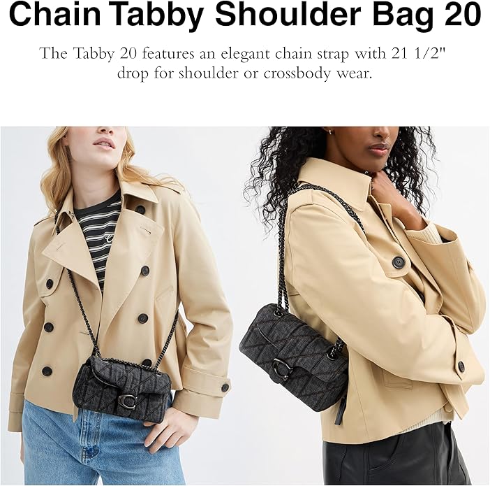 A captivating blend of vintage archival charm and modern luxury, the Coach Tabby Shoulder Bag in Indigo is a designer must-have for 2025. Crafted from premium quilted denim with pillow-quilt-style stitching, and trimmed in soft Napa leather, this bag exudes texture-rich elegance and tactile appeal—perfect for both casual chic and sophisticated style. Its push-lock closure and additional magnetic snap pocket offer secure yet convenient access to essentials. Inside, durable fabric lining, while externally, a handy slip pocket ensures mobile access on the go. Versatility is key: the chain strap with a 21.5-inch drop allows wear as a shoulder or crossbody bag. Compact yet roomy, the dimensions of 7.75″ L × 4.25″ H × 2.75″ W make it ideal for daily carry without bulk. With origins in Coach’s 1970s heritage and a legacy of timeless Americana craftsmanship, this piece is a fusion of luxury, heritage, and practicality. A top pick for fashion-forward women, Instagram-ready accessories, luxury gifting, and seasonal bestsellers like Indigo denim.